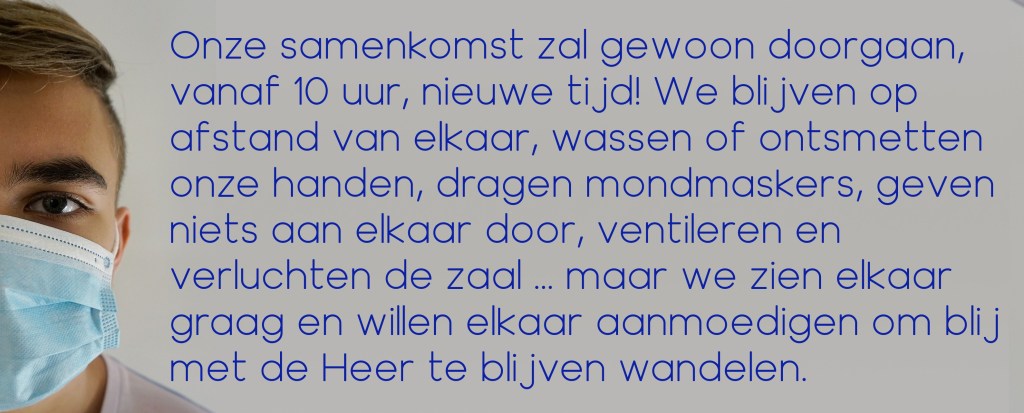 Our meeting will be held as usual, starting at 10 o’clock, new time! We keep a distance from each other, wash or disinfect our hands, wear mouth masks, don’t pass anything to each other, ventilate and air the room … but we love each other and want to encourage everyone to keep walking happily with the Lord.